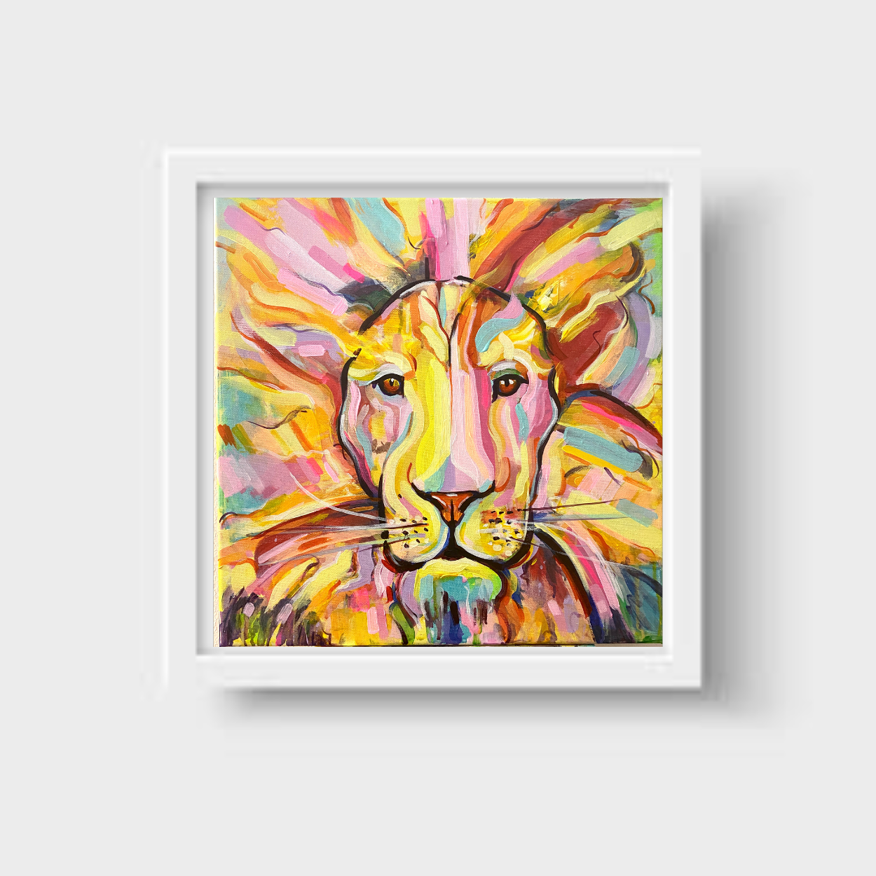Esta obra representa a un león hecho de fuego y color, con una melena ardiente y mirada imponente. Cada trazo transmite su energía salvaje, su liderazgo natural y su simbolismo ancestral.
