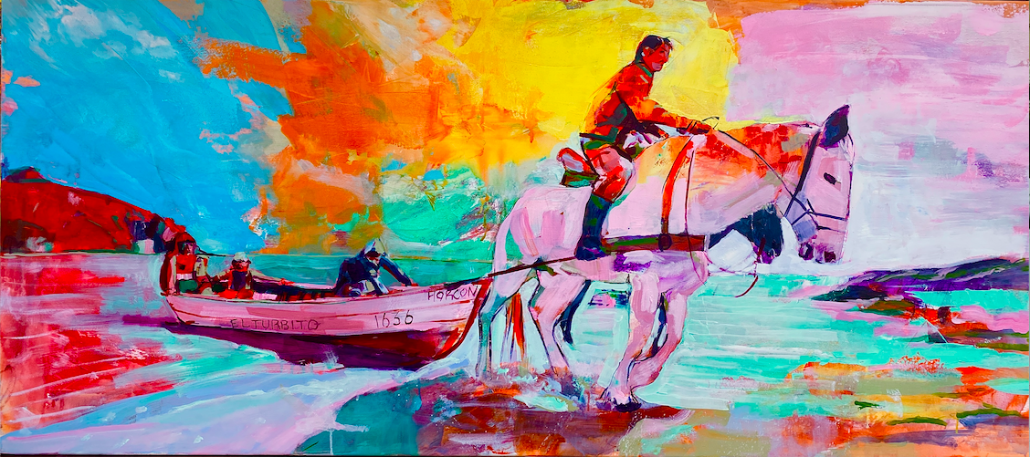 Esta obra retrata una escena tradicional de la caleta de Horcón: el momento en que los botes son sacados del mar con la fuerza de los caballos. Aunque hoy en día muchos pescadores utilizan tractores, aún hay quienes mantienen viva esta costumbre, conectando pasado y presente en cada jornada.