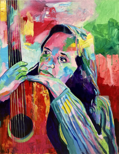 Esta obra es un retrato vibrante de Violeta Parra, construido a partir de una paleta de colores complementarios intensos que dialogan entre sí para transmitir fuerza, sensibilidad y rebeldía creativa. La composición busca capturar no solo su imagen, sino su espíritu indomable, su raíz popular y su profunda carga emocional.